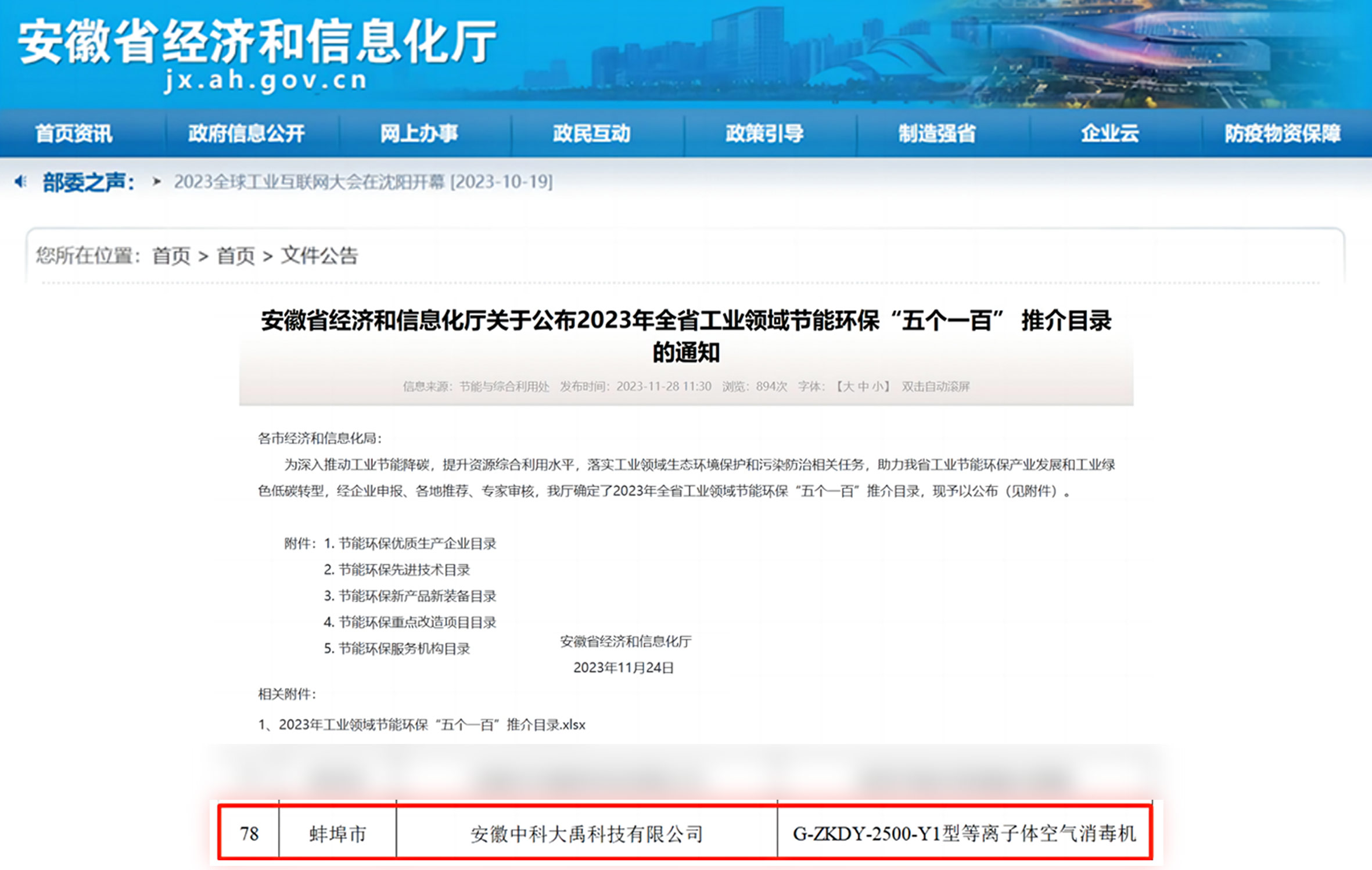 入選2023年全省工業(yè)領(lǐng)域節(jié)能環(huán)保“五個一百”推介目錄(節(jié)能環(huán)保新產(chǎn)品新裝備:G-ZKDY-2500-Y1型等離子體空氣消毒機)